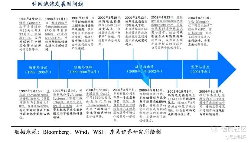 在东吴证券整理的互联网泡沫周期中,会非常清楚看到一条线索:萌芽期享受政策红利——发展期推高资本开支——业绩不能匹配——经济过热加息——流动性与基本面相遇——泡沫破灭。