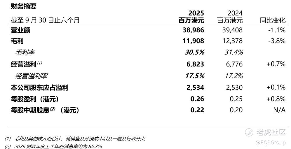期内,集团营业额保持稳定,达38,986百万港元 (2025财政年度上半年︰39,408百万港元),而毛利率保持于30%以上,处于历史较高水平。经营溢利按年上升0.7%至6,823百万港元(2025财政年度上半年︰6,776百万港元)。经营溢利率保持韧性并扩阔至17.5%,创下近五年新高。这些成绩均印证集团能迅速适应市场变化,亦能准确把握新机遇。