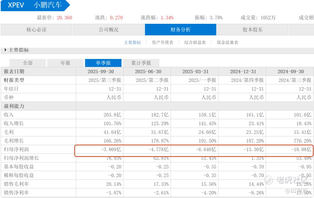小鹏在智驾和双能源战略X9超级增程车型预售火爆,以及MONA M03单月交付超1.5万辆,G6累计交付6.5万辆的规模优势,加上费用优化,2025年Q3小鹏汽车综合毛利率突破20%,净亏损收窄至3.8亿元,汽车毛利率达13.1%,今年第四季度有望盈利。近四个季度净亏损分别为13.3亿元、6.64亿元、4.778亿元和3.8亿元,亏损收窄明显。