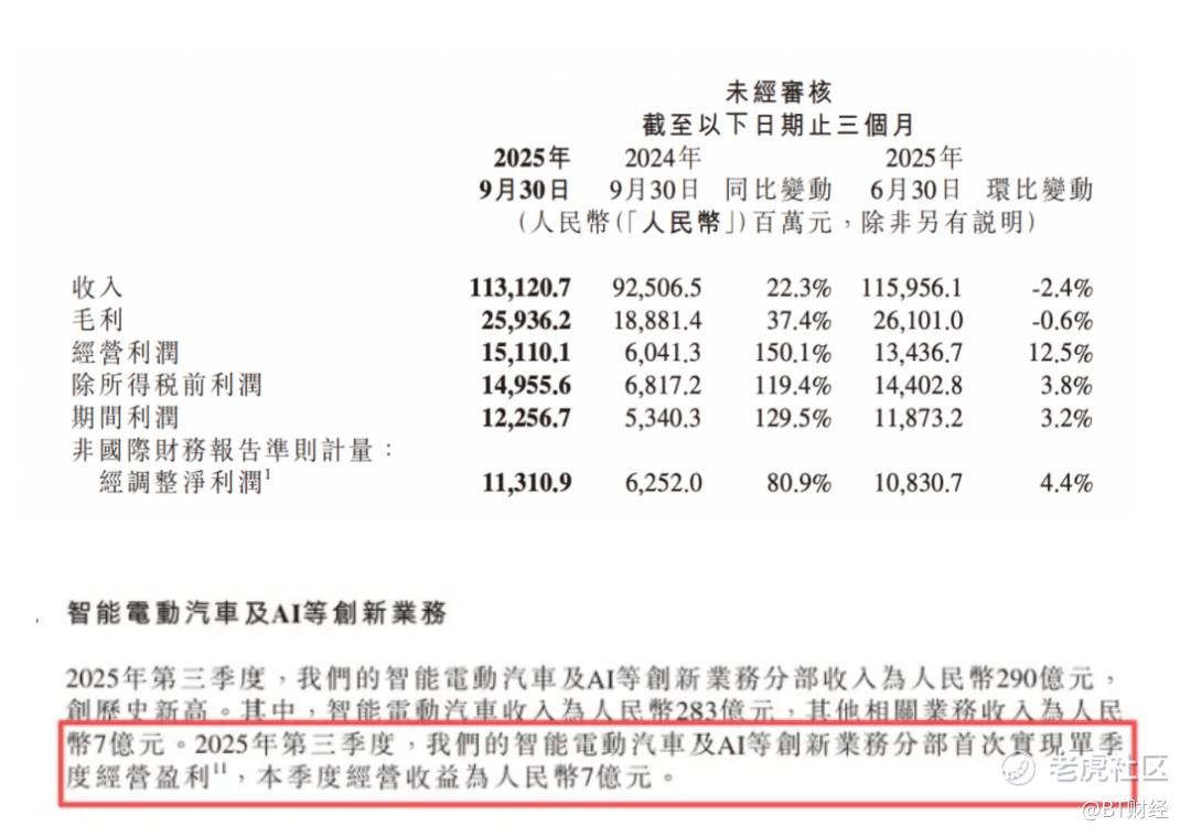小米集团最新发布的财报显示,第三季度小米集团总收入达1131亿元,同比增长22.3%,连续4个季度突破千亿;经调整净利润为113亿元,同比大增80.9%,创历史新高。最引人关注的还是小米的汽车业务,汽车业务及AI等创新业务三季度收入飙升至290亿元,同比增长199.2%。其中智能电动汽车收入283亿元,同比去年的同期的95亿元增长197.9%,经营收益为7亿元。第三季度小米汽车的总销量为108796辆,这意味着如今小米的单车净利润达6434元。