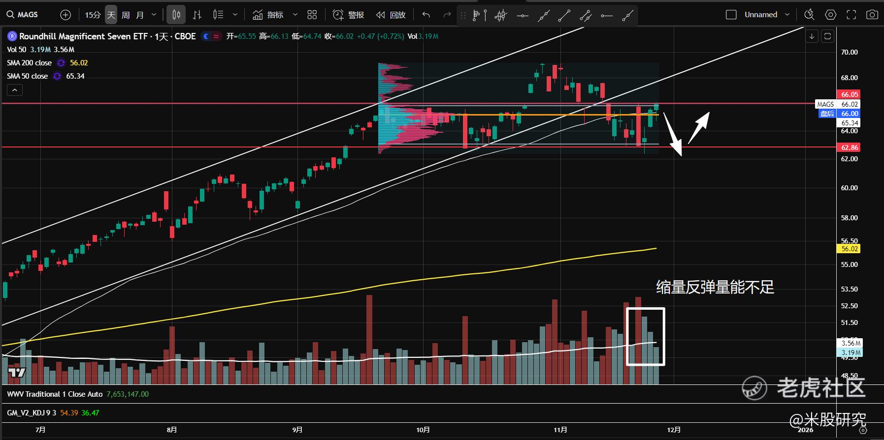1、七大科技股ETF($Roundhill Magnificent Seven ETF(MAGS)$ )跌破上涨通道后,进入横盘状态。11月以来成交量巨大,多空分歧严重。最近缩量反弹至价值区间上沿(VAH),但需求不足,可能将再次回落。