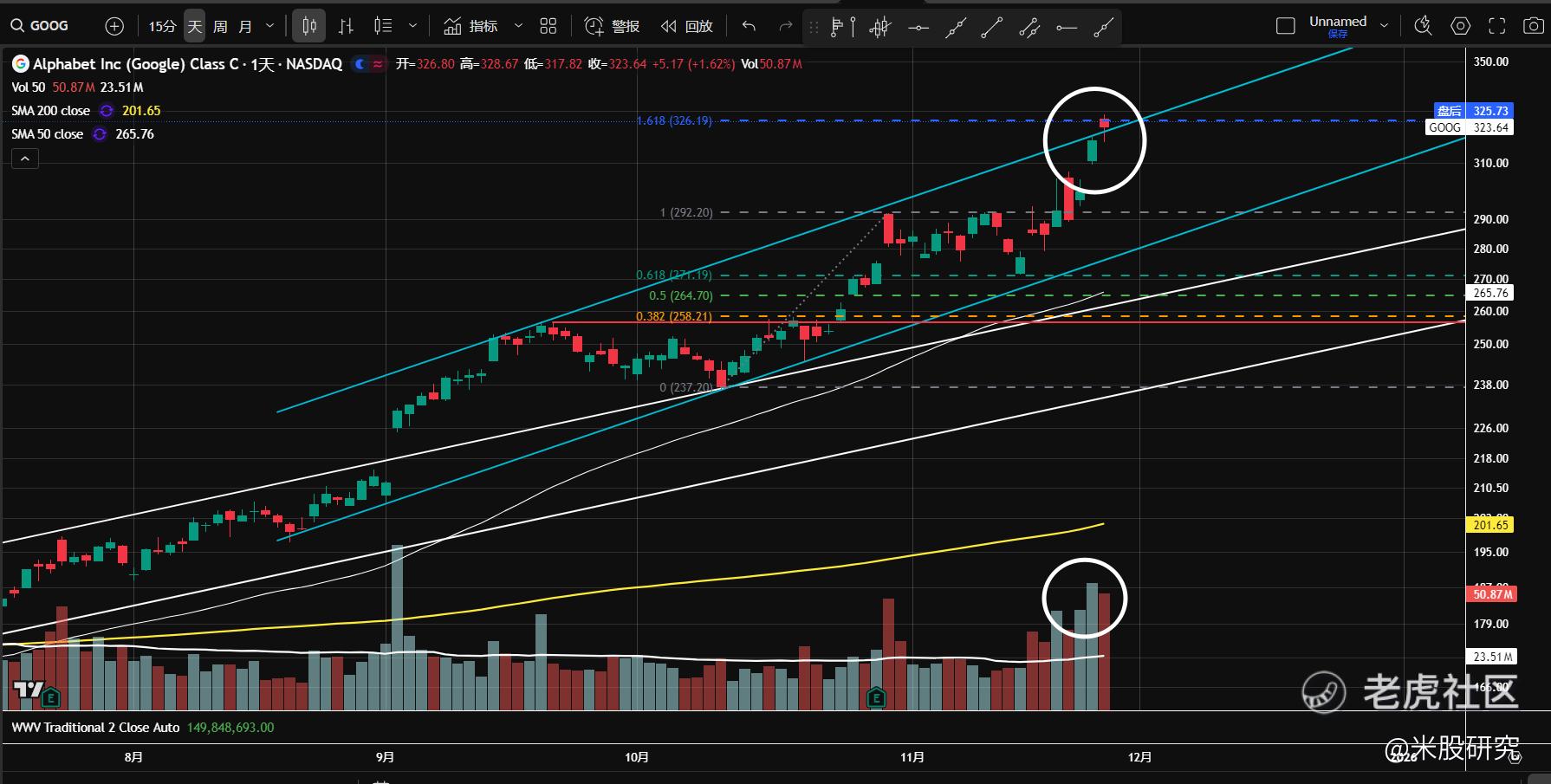 6、$GOOG$ 技术非常强劲,并突破了上涨通道上沿,这意味着价格可能将加速上涨。成交量在急剧扩大,注意冲高调整风险,不宜追高。