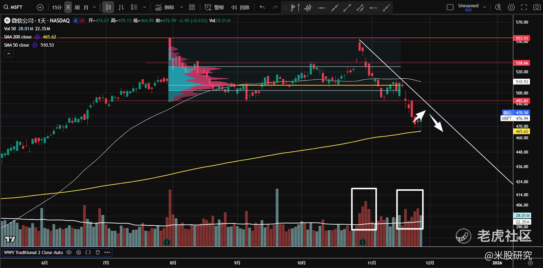 3、 $微软(MSFT)$ 跌破493支撑后一路下跌,目前在年线位置暂时得到支撑。10月底开始带量下跌,空头量价循环。在突破新下降趋势线前,不建议做多。