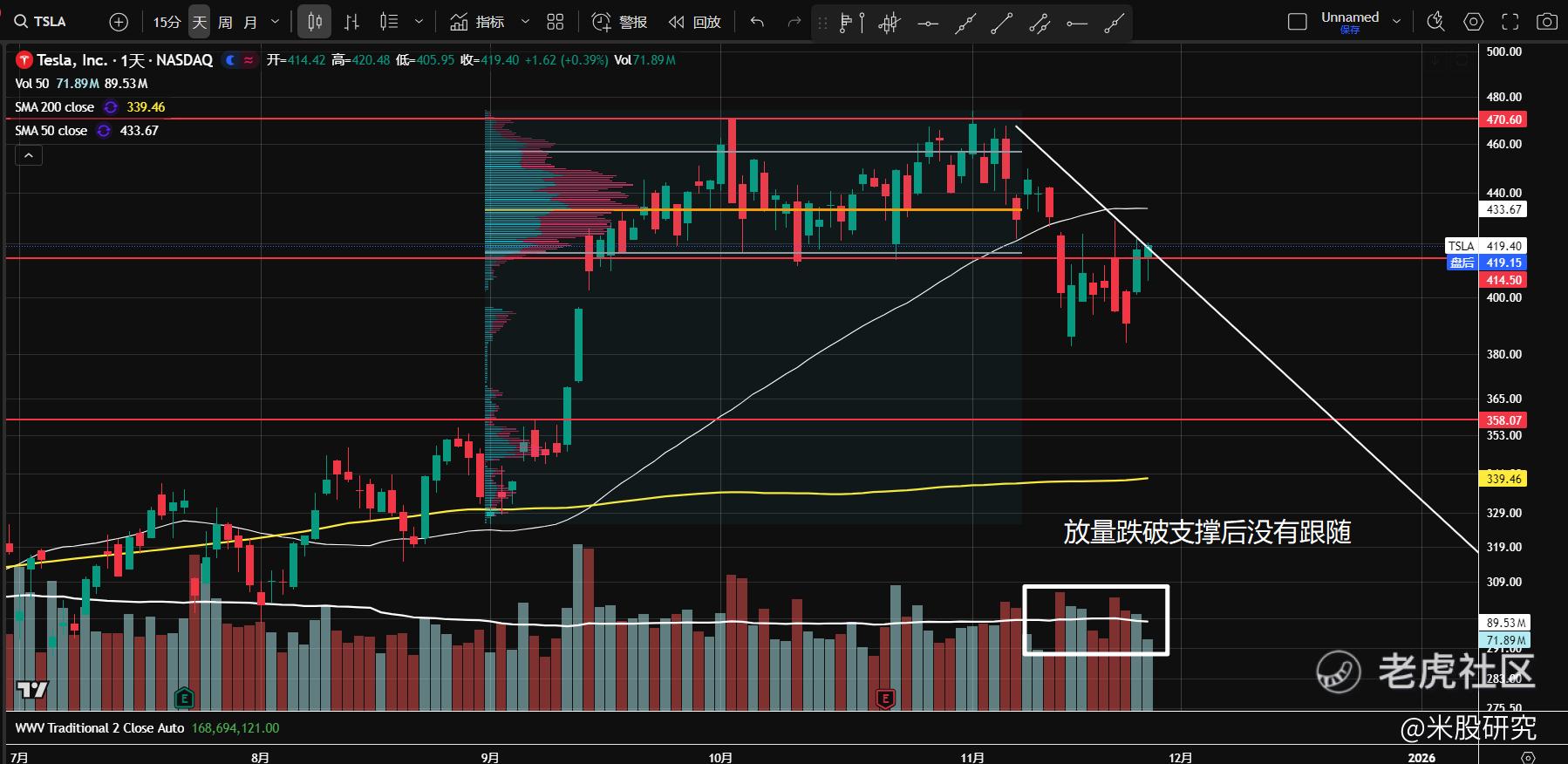 8、 $特斯拉 (TSLA)$ 放量跌破9月以来的盘整区间后,没有进一步跟随下跌。过去两个交易日,价格反弹回盘整区间内,有交易假突破的做多机会。