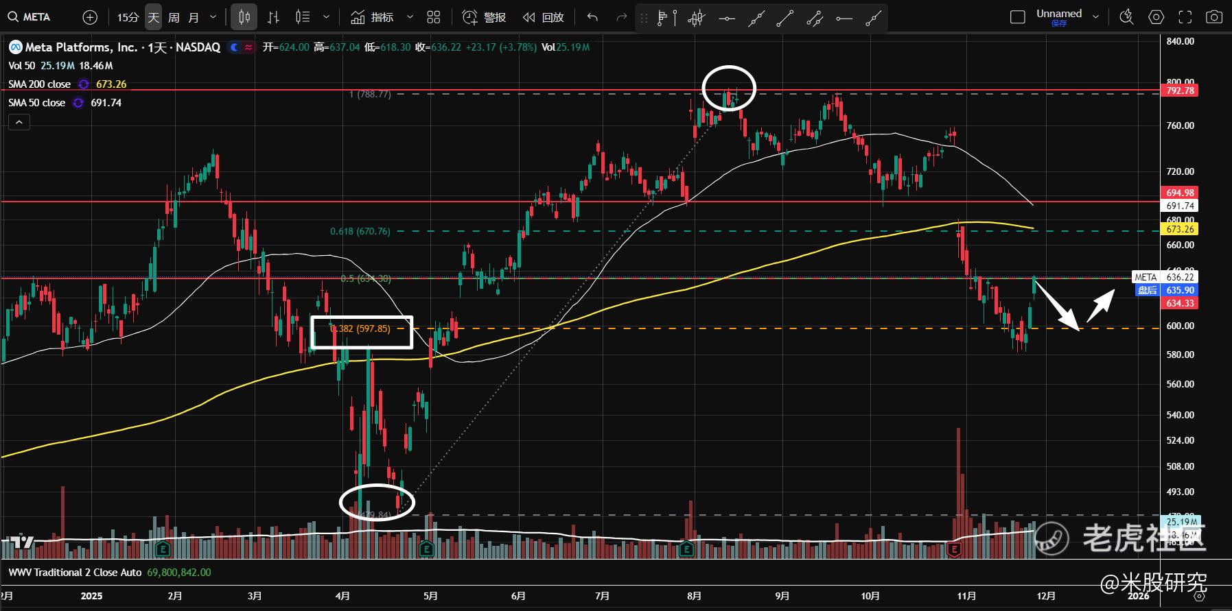 7、 $Meta Platforms (META)$ 技术走势是七大科技股中最弱的。股价目前在今年4~8月上涨的38.2%回调位企稳反弹,但底部构建需要时间,不易一蹴而就,抄底需把握好节奏。