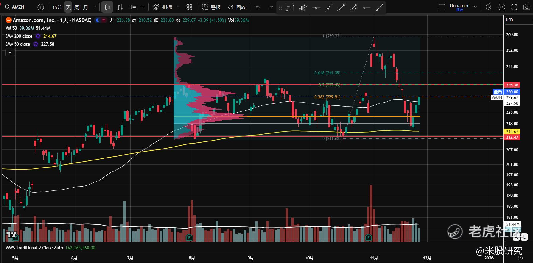 5、 $亚马逊(AMZN)$ 已跌回之前的盘整区间,11月的突破证明是假突破,并积累了大量套牢盘。再度上行将阻力重重,不要急于抄底。