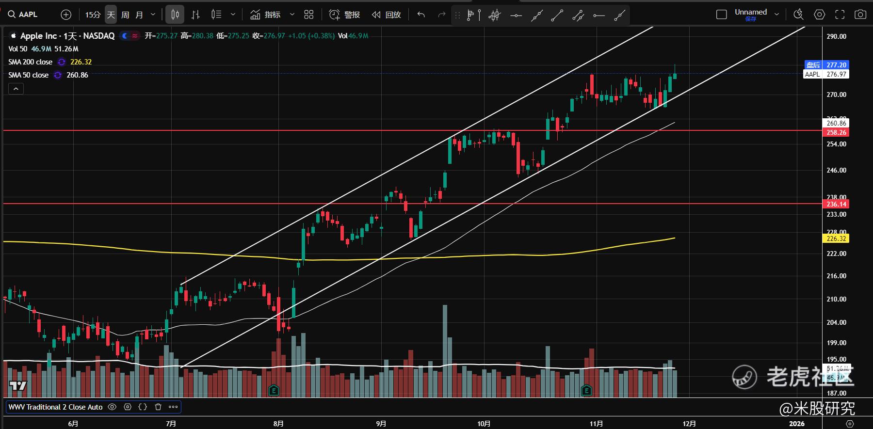 4、 $苹果(AAPL)$ 自7月以来一直运行在上涨通道内,非常标准的上涨走势,量价多头循环,多单继续持有。