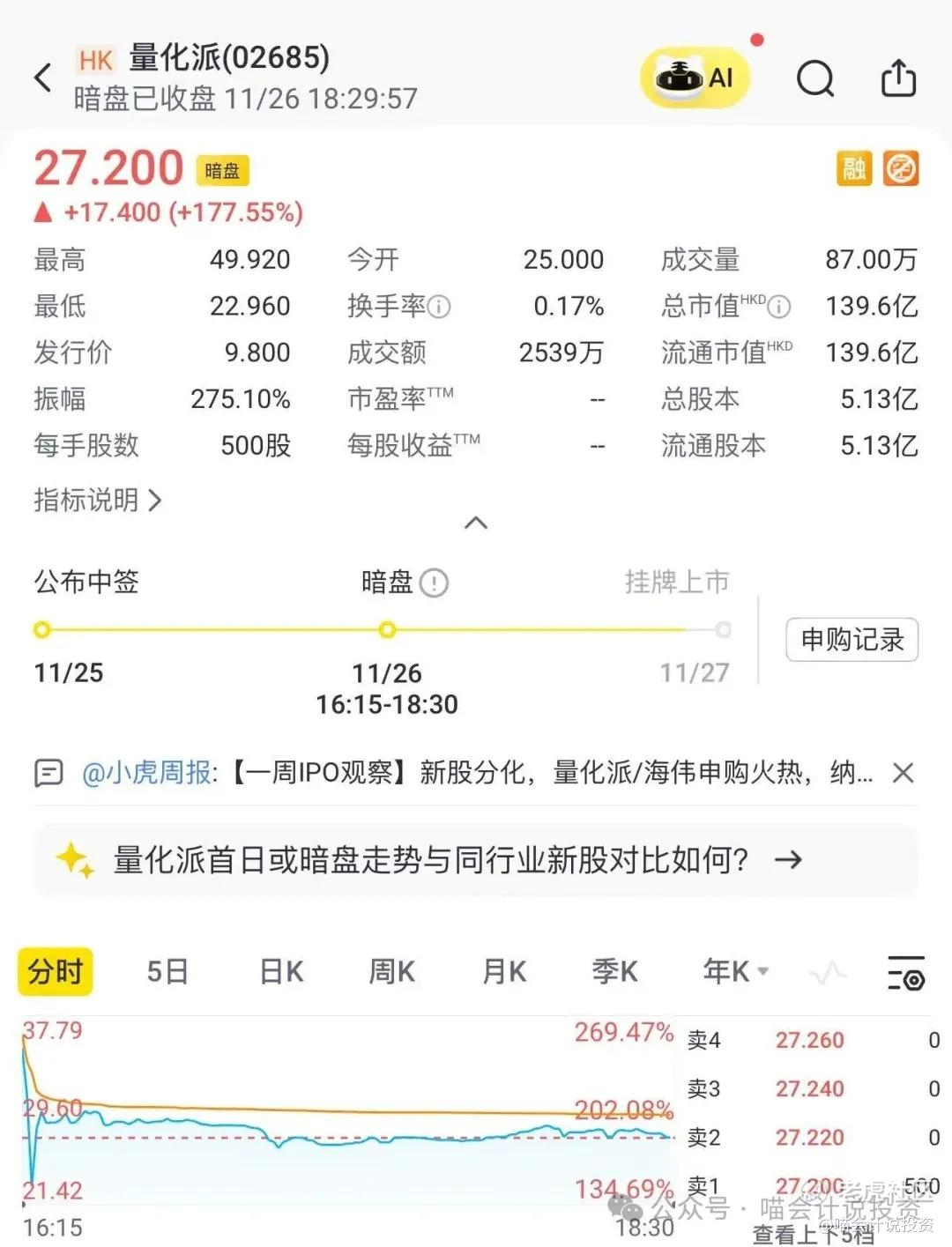 量化派(02685.HK)在11月26日的辉立暗盘: