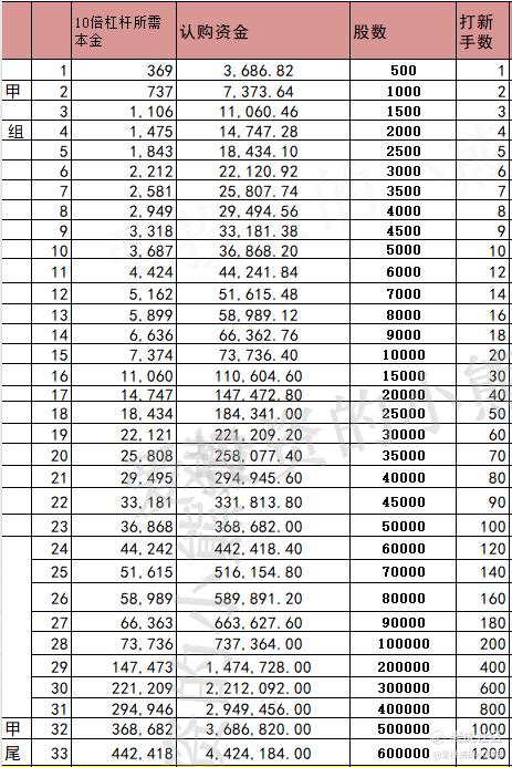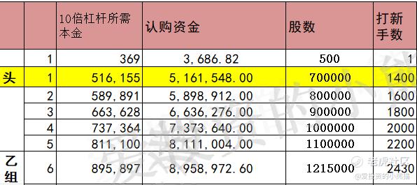 乙头需要认购资金517,这个票顶头锤,90万的本金就够了 ,毕竟募资金额小啊。乙组的各档融资所需要的本金还有融资金额对应如下表: