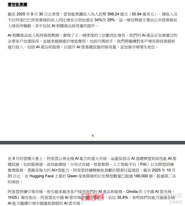 AI技术层面,在这一季度,云智能集团营收398.24亿元,总收入同比增长加速至34%,不计阿里巴巴并表业务的收入同比增长加速至29%。同时,阿里巴巴AI相关产品收入连续9个季度实现三位数同比增长。