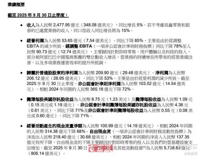 利润方面,这一季度的经营利润为53.65亿元,同比下降85%;经调整EBITA同比下降78%至90.73亿元。其中,归属于普通股股东的净利润为209.90亿元,净利润为206.12亿元,同比下降53%。非公认会计准则下,净利润为103.52亿元,同比下降72%。