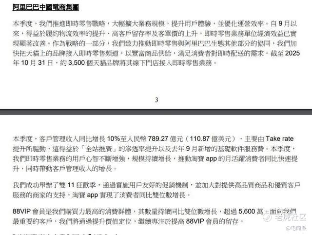 其中,在这一季度,电商客户管理收入(CMR)同比增长10%,即时零售业务收入同比增长60%。