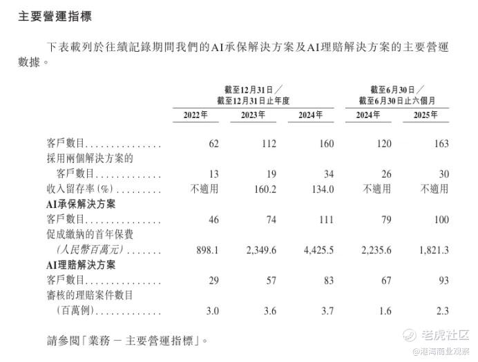 各期,AI承保解决方案的客户数目分别为46家、74家、111家和100家,促成缴纳的首年保费分别为8.98亿元、23.5亿元、44.26亿元和18.21亿元;AI理赔解决方案的客户数目分别为29家、57家、83家和93家,审核的理赔案件数目分别为300万例、360万例、370万例和230万例。