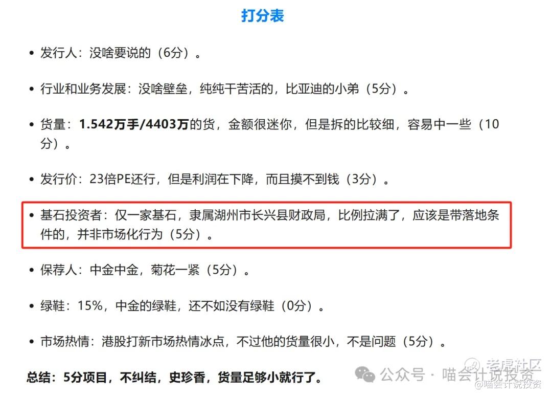 注意看喵老师事前的打分表,这家单一基石投资者的投资行为,一般都是带落地条件的,不作数的。
