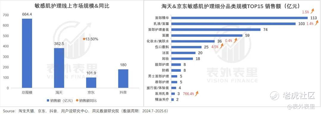 “药不能停”式的庞大需求,让一个千亿市场拔地而起。如下图,截至2025年6月,中国线上敏感肌护理市场规模整体达到664.4亿元。
