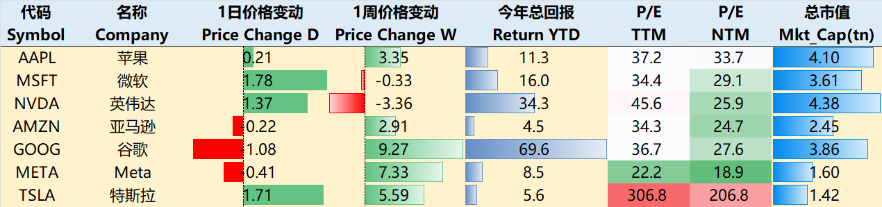 大科技本周在英伟达财报后普遍回调,但仍有分歧。至11月26日收盘,过去一周 $苹果(AAPL)$ +3.35%, $微软(MSFT)$ -0.33%, $英伟达(NVDA)$ -3.36%, $亚马逊(AMZN)$ +2.91%, $谷歌(GOOG)$ $谷歌A(GOOGL)$ +9.27%, $Meta Platforms, Inc.(META)$ +7.33%, $特斯拉(TSLA)$ +5.59%。