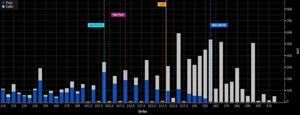 从期权方面看,以12月的月期权来看,现价高于最大痛点,但主要因为PUT的大单集中在更价外的部分(200-220),而Call那边却很集中在250左右,买卖双方的分歧其实较大,也体现为当前股价上的谨慎波动。