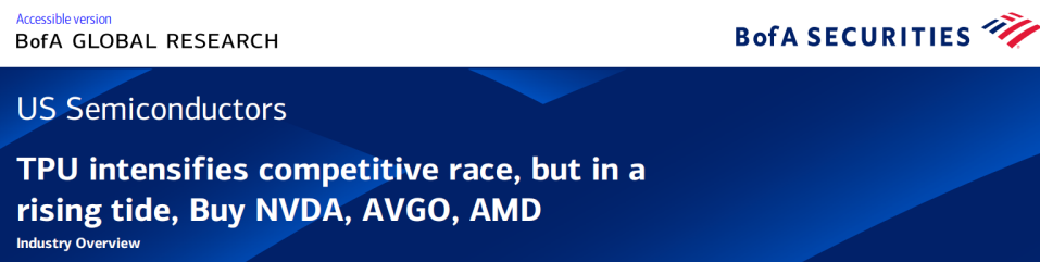 美银判断谷歌的TPU加剧了AI加速器领域的竞争,但考虑到行业整体处于增长浪潮中,维持英伟达、博通、AMD“买入”投资评级。