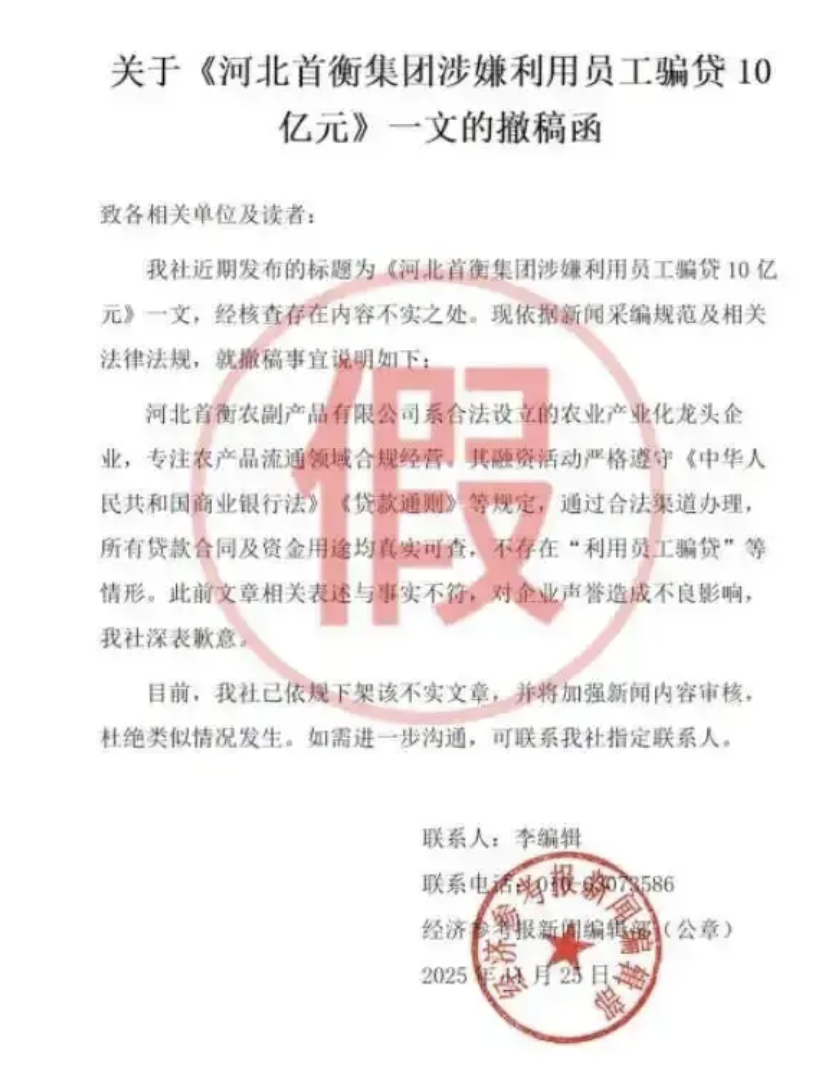 2025年11月,一份伪造《经济参考报》名义的撤稿函,让河北首衡集团涉嫌10亿骗贷的旧闻再度发酵。这场“撤稿函闹剧”不仅未掩盖真相,反而让《经济参考报》此前揭露的企业违规操作细节更加引人关注。