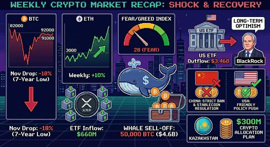 本周加密市场剧烈震荡后迎来修复,比特币从82000美元低位回升至91000-92000美元区间,但月度跌幅逼近18%,创七年来最弱11月表现。