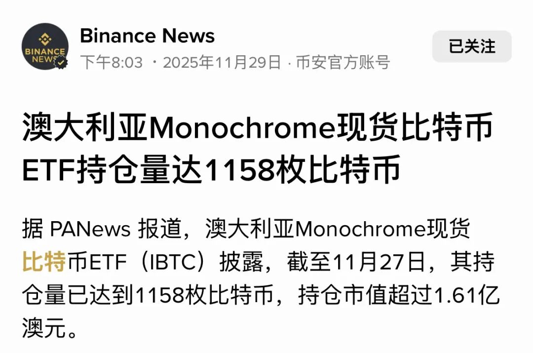 2. 澳大利亚Monochrome现货比特币ETF(IBTC)11月底持仓达1158枚BTC,价值超1.61亿澳元,反映亚太机构投资者持续增配。