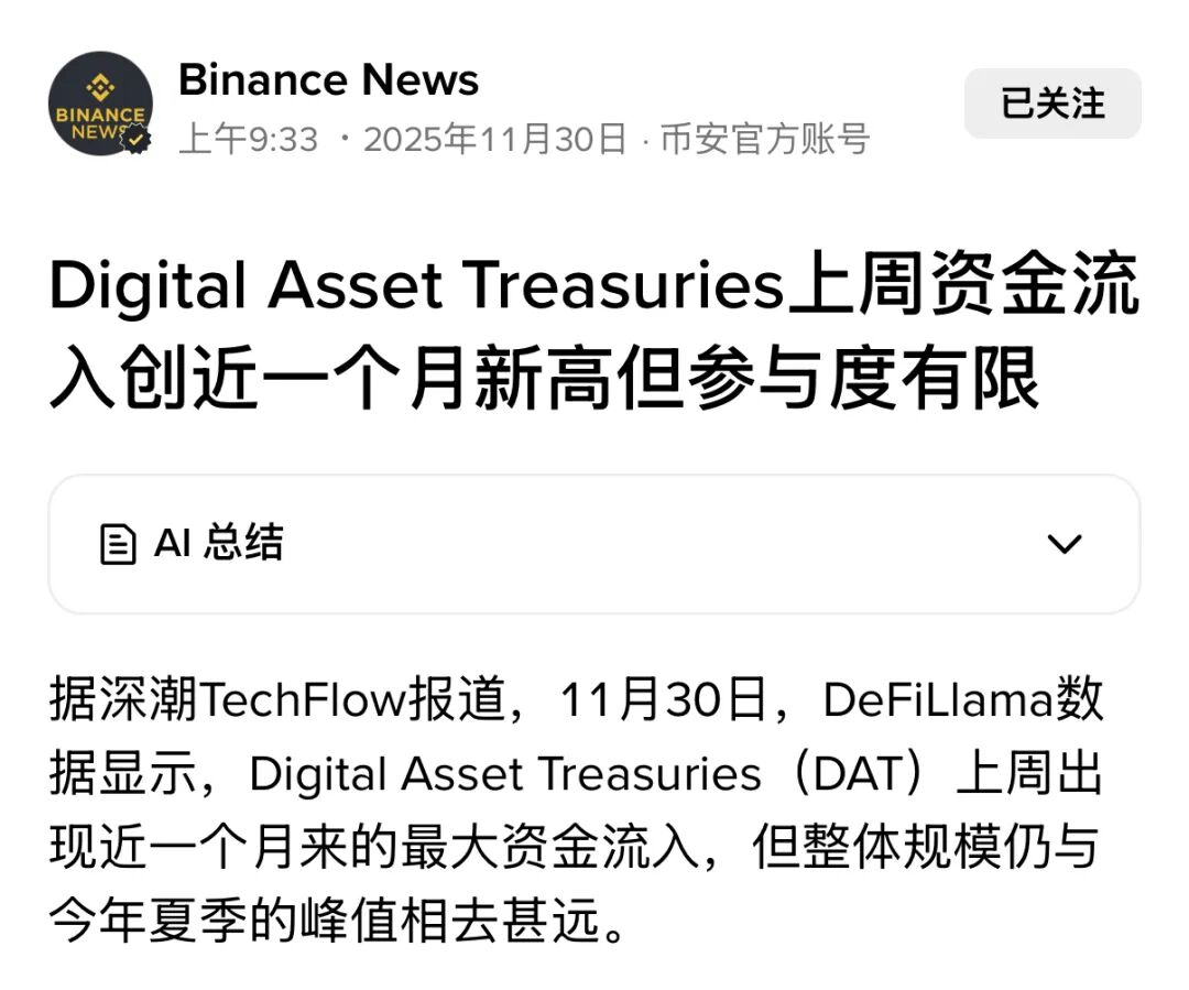 5. Digital Asset Treasuries(DAT)上周资金流入创近一个月新高,但整体参与规模距夏季峰值仍有较大差距,市场活跃度偏弱。