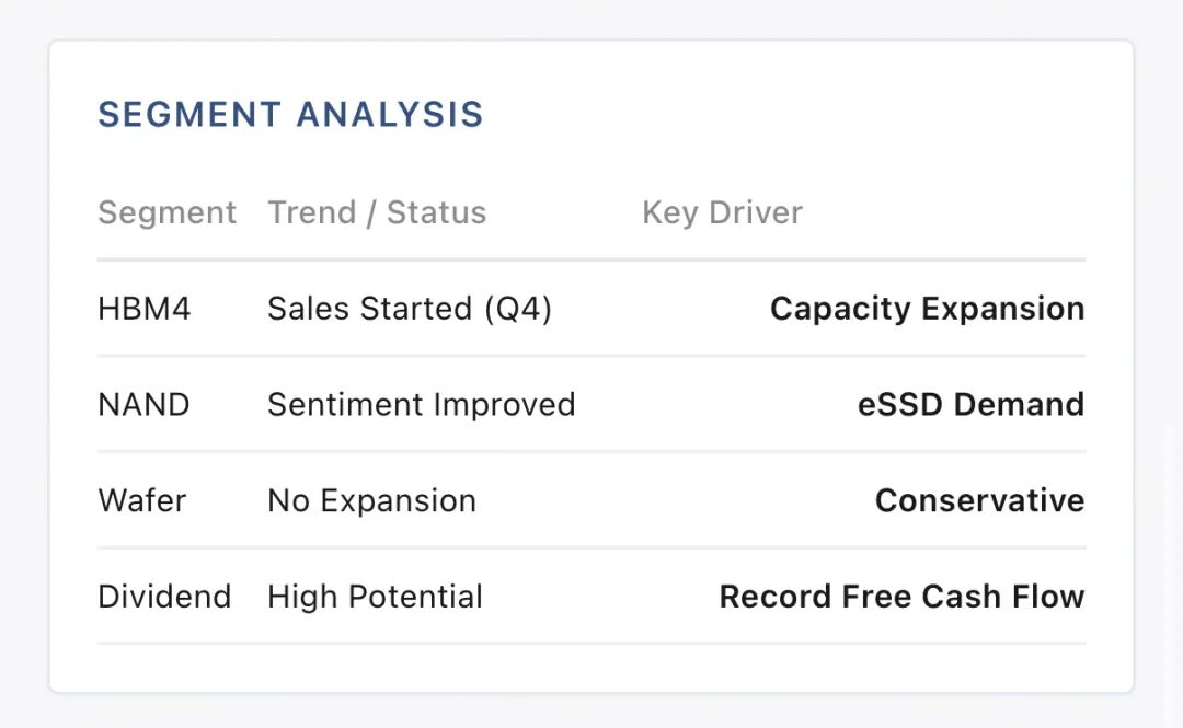 研报特别指出,"our channel checks indicate that Hynix is the No. 1 HBM3e supplier to Google/Broadcom"(我们的渠道调研显示,海力士是谷歌/博通HBM3e的第一供应商)。NAND方面情绪也较6-12个月前明显转暖,eSSD需求是主要推手,但海力士明确表示不会扩晶圆产能。