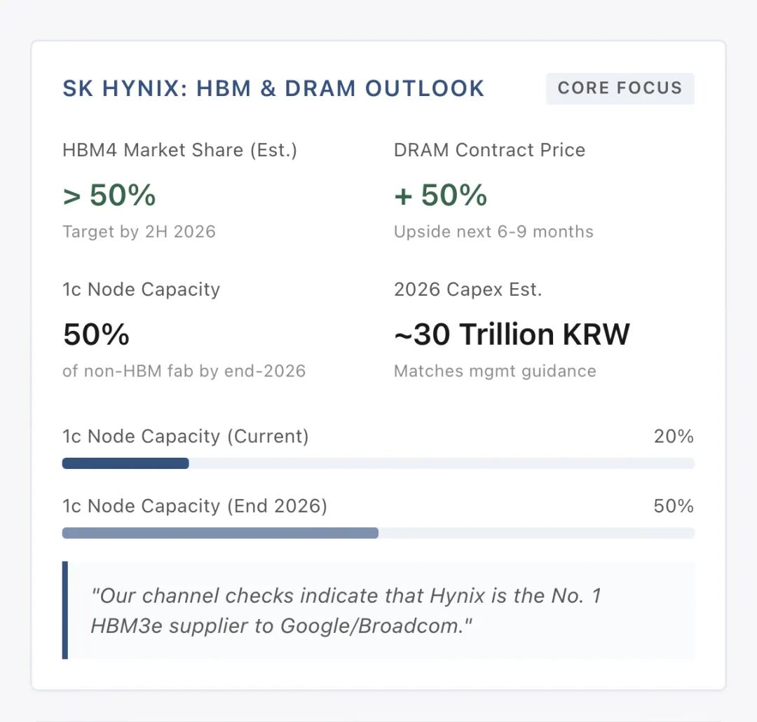 HBM4量产与产能扩张均按计划推进,1c节点产能将在2026年底覆盖韩国fab约50%的非HBM产能(目前仅20%)。
