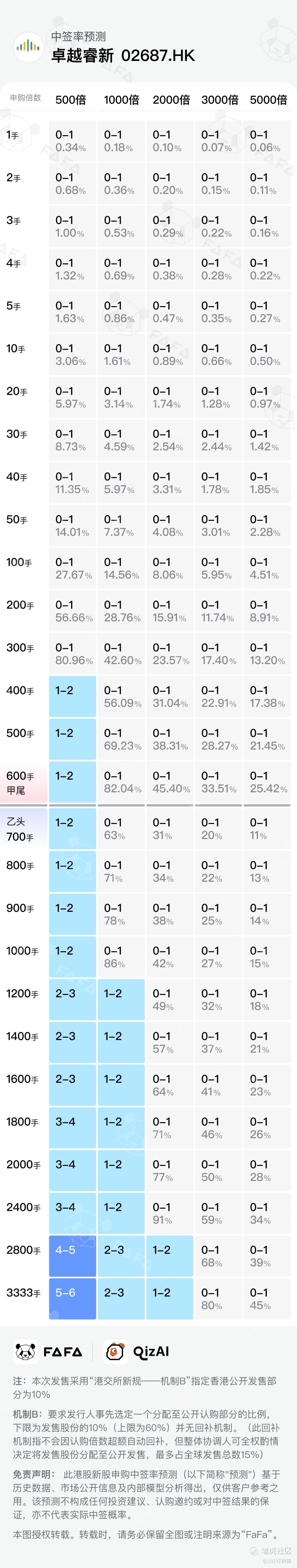 卓越睿新采用机制B,回拨10%;全球发售666.67万股,香港发售66.67万股,一手是100股,甲乙组共计6667手,全员抽奖了;甲尾申购需要46万本金,乙头申购需要53万本金,现在热度不高,一方面是乐摩科技和金岩高岭新材打新资金还没释放,一方面是海伟股份破发,首个机制B破发股(不算之前的AH股),打新热情被浇灭了,以及同时出现了4个新股,会分散资金安排。预计最终应该是在1200倍左右。由农银独家保荐,无基石,无绿鞋,农银过往保荐的港股项目比较一般。公司在教育细分领域有着领先地位,教育行业前景好,但是也容易受到政策的影响。