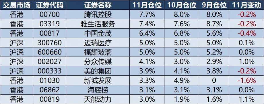 其中,A股持仓34.1%↘,港股58.4%↗,美股0.1%→,日股0.1%→。11月看来还是加了港股。