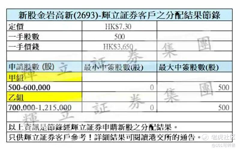 金岩高新(2693)出分配结果了,全员抽奖;定价:7.3,一手500股;恭喜中签的老板们!预测涨幅大概是40-60%,具体分析可以看看上一篇文章,只做参考,不做投资买卖建议。