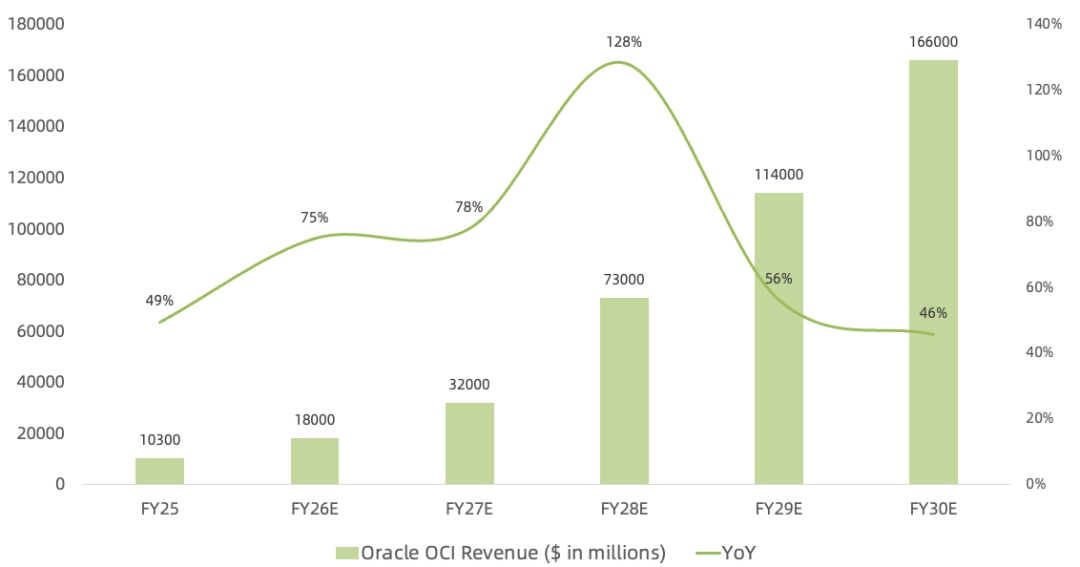 Q3营收71.9亿美元,同比增长28%,增速环比增长1个百分点;其中OCI(IaaS)营收33亿美元,同比增长55%,增速环比增长3个百分点;预计FY26 OCI营收180亿美元,同比增长77%,FY27/FY28/FY29/FY30 IaaS营收分别为320/730/1140/1660亿,OCI毛利率将会在30%-40%之间;本季度capex 85亿美元,预计FY26 capex从250亿美元上调至350亿美元,绝大部分是用于数据中心设备,而不是用于土地或建筑。