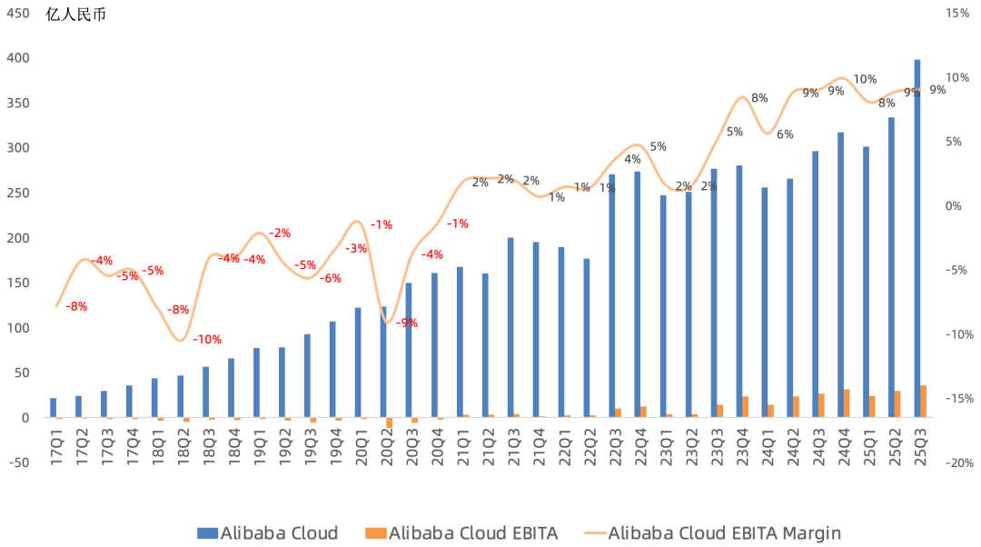 Q3营收398亿人民币(55.94亿美元),同比增长34%,增速环比加速8个百分点,不考虑内部合并营收,同比增长29%,增速环比加速3个百分点;主要以AI在内的核心公有云业务营收大幅增长,AI相关营收连续9个季度实现同比三位数增长;据Omida统计,阿里云今年上半年以35.8%的市场份额领跑中国AI云市场。