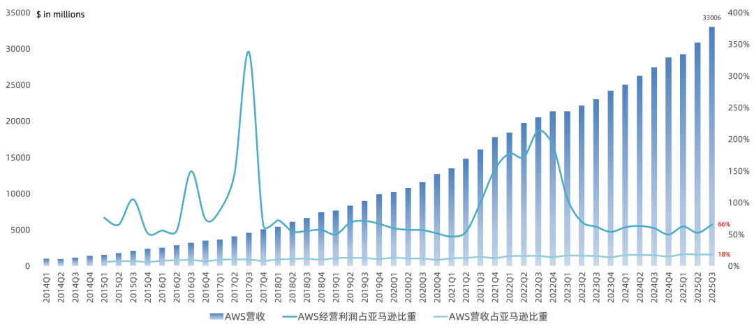 AWS Q3营收占亚马逊总营收18%,贡献了亚马逊66%的经营利润。