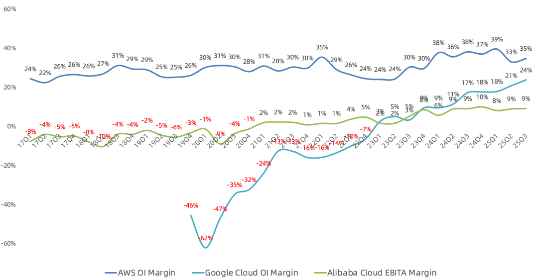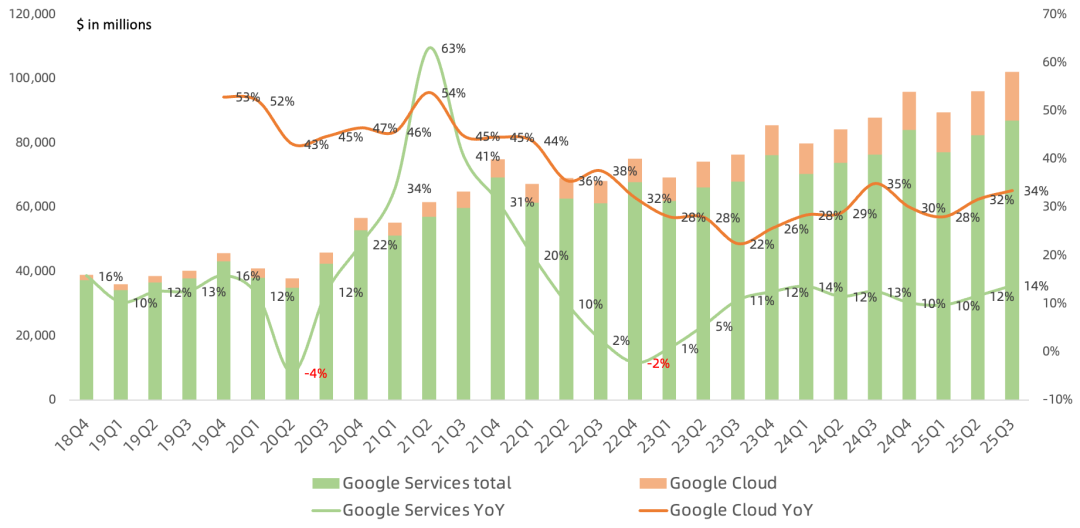 谷歌云Q3营收152亿美元,同比增长34%,增速环比加速2个百分点;经营利润36亿美元,经营利润率24%,同比提升7个百分点。