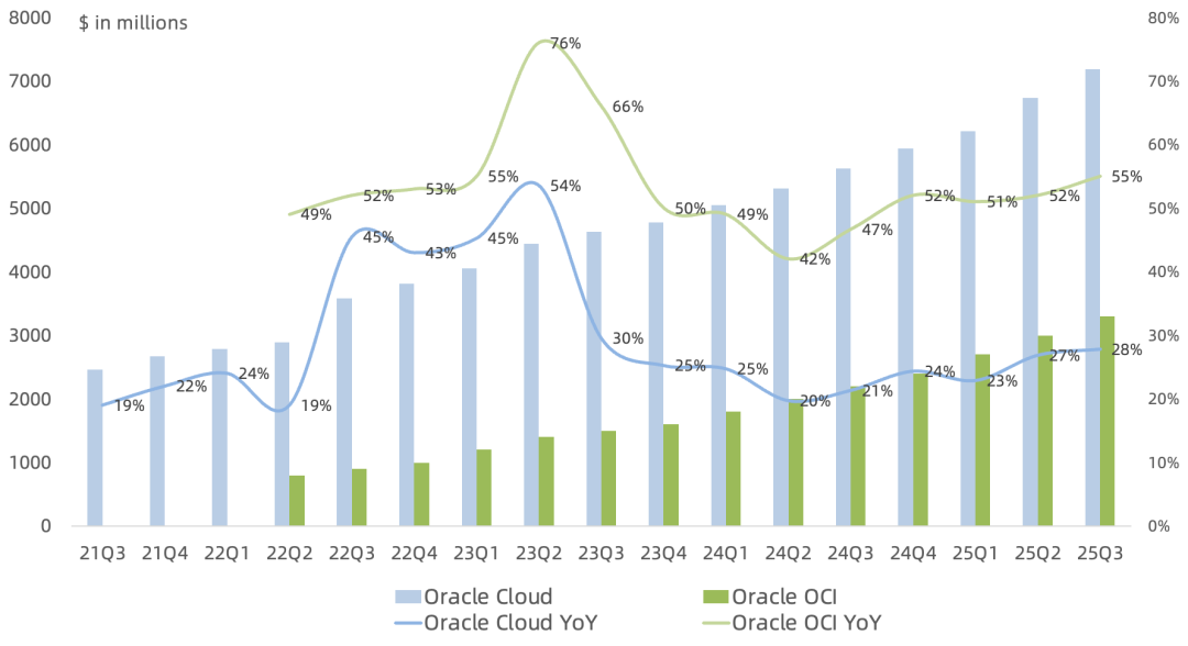 OCI consumption营收同比增长57%,持续供不应求,预计FY26 consumption增长更快;来自Azure/GCP/AWS的MultiCloud Database营收环比增长,预计后续仍将逐季环比增长;Cloud Database营收同比增长32%,年化营收28亿美元,Autonomous database consumption营收同比增长43%;RPO超5000亿美元,其中包括Meta 200亿美元以及OpenAI之外的450亿美元订单。