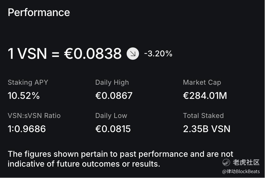 在收益模型上,$VSN 采用排放 + 协议费分红 + 回购销毁的组合机制。用户可在 app.vision.now 上质押 $VSN 获取收益,目前年化回报率约 10.5%,主要来源包括基础排放奖励及来自 Bitpanda 等外部生态的手续费分红。