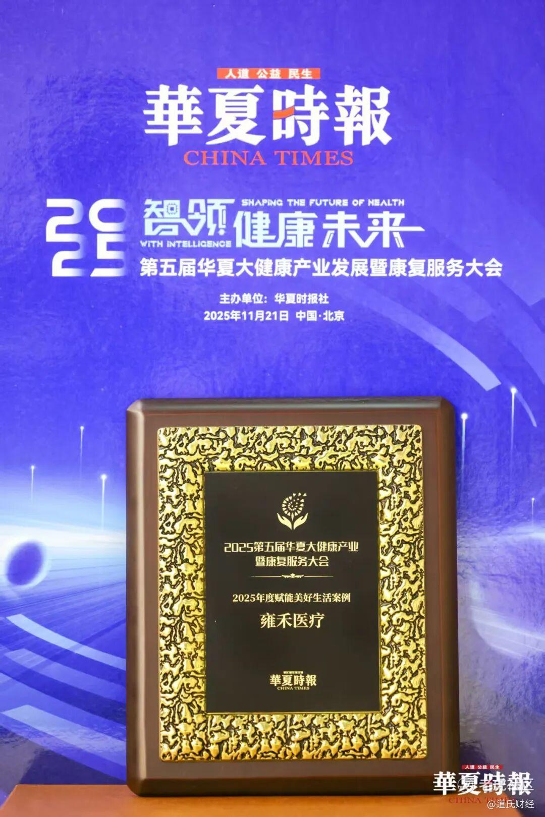 11月21日,由华夏时报社主办的“2025第五届华夏大健康产业发展暨康复服务大会”在北京成功举行,雍禾医疗集团荣获2025年华夏大健康金手杖优秀案例奖项。