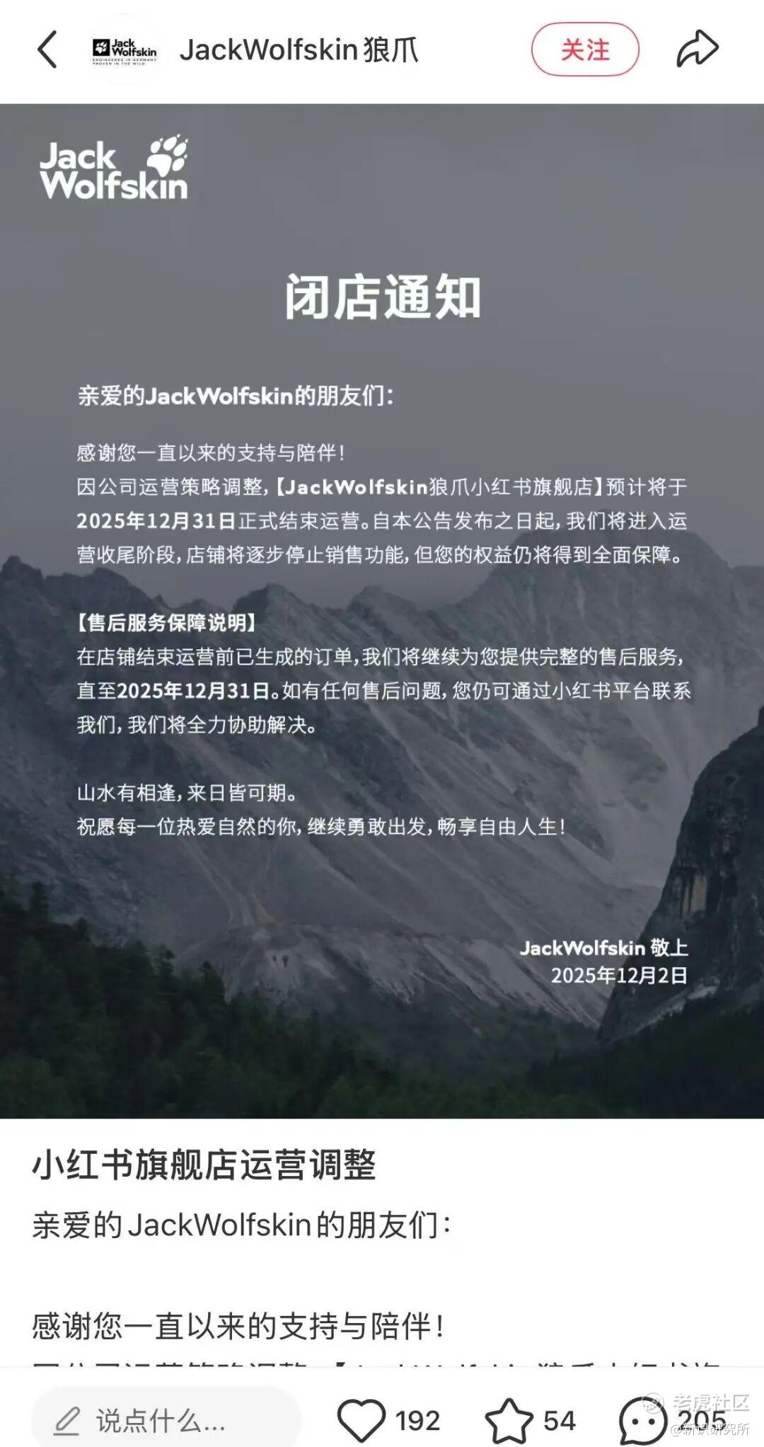 12月2日,德国户外品牌Jack Wolfskin(狼爪)在小红书平台发布闭店通知,宣布其小红书旗舰店将于2025年12月31日正式终止运营。这一动作距安踏体育完成对狼爪的全资收购仅半年,被业内解读为安踏对该品牌渠道整合的关键一步。