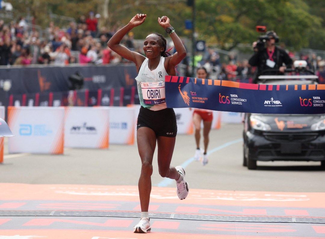 运动员海伦·奥比里(Hellen Obiri)穿着Cloudboom Strike LS
