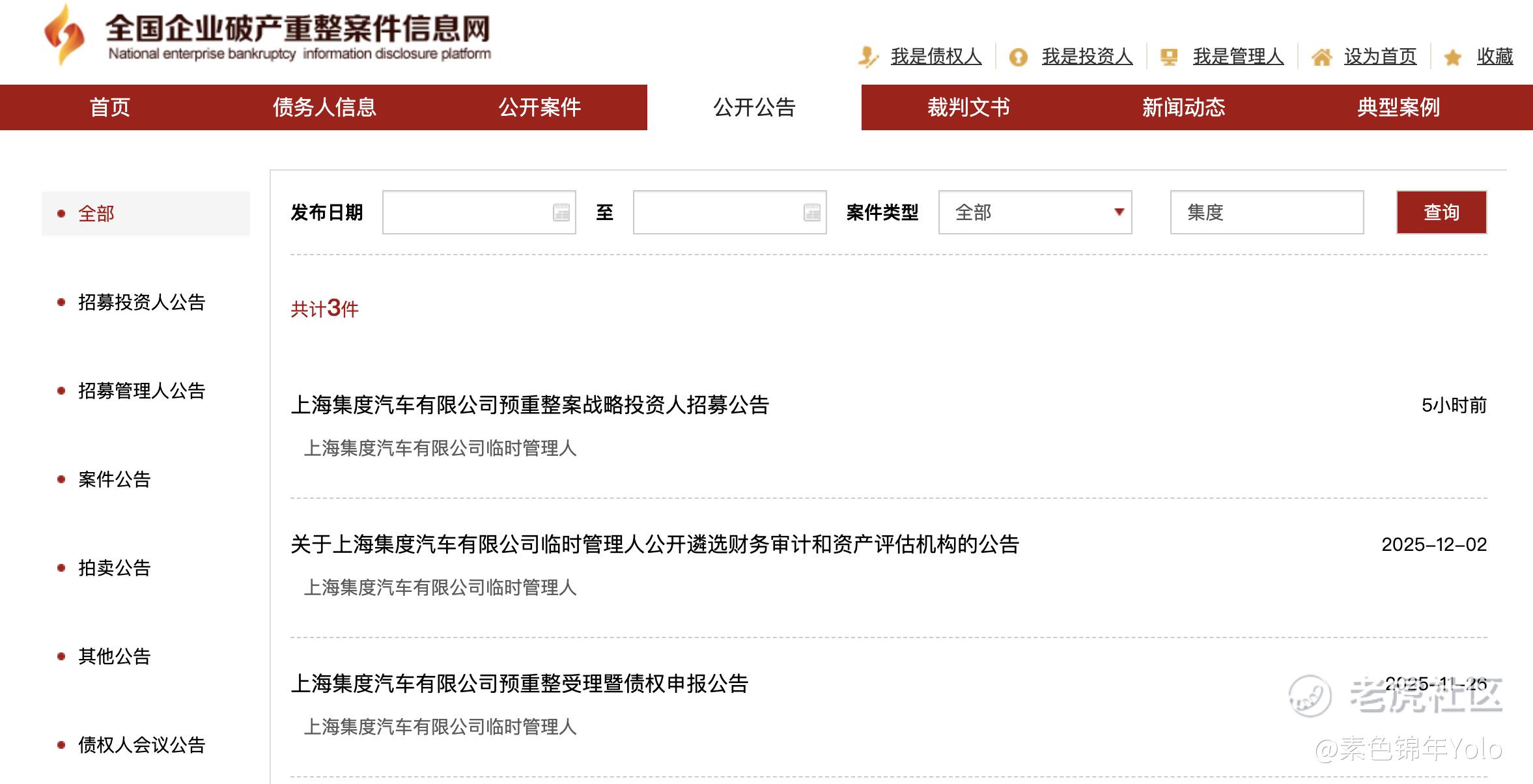 今天(12月3日),上海集度汽车有限公司正式发布《预重整案战略投资人招募公告》。这份看似枯燥的法律文件,在本小会计看来,更像是一封早已写好收件人的“定向邀请函”。