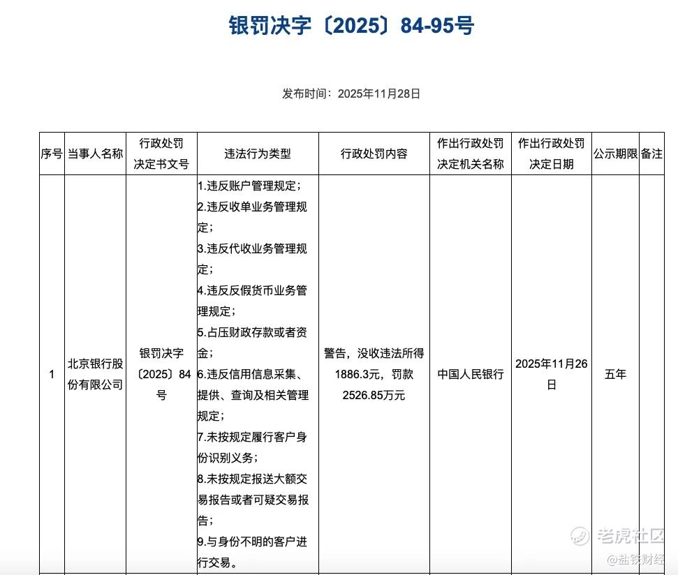 日前,中国人民银行官网披露的行政处罚信息显示,北京银行因多项业务违规被处以警告、没收违法所得1886.3元,并处罚款2526.85万元,罚没款合计约2527万元。