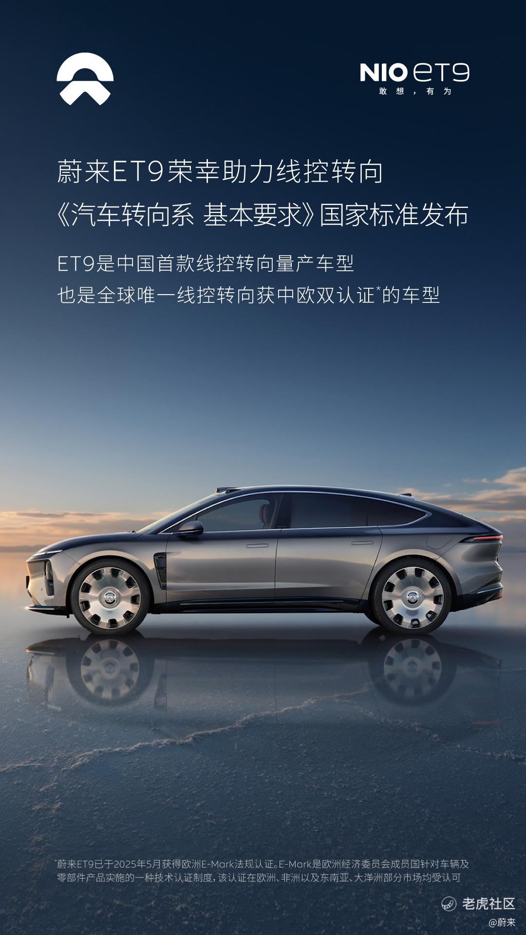 蔚来ET9荣幸助力线控转向GB17675-2025《汽车转向系 基本要求》国家标准正式发布,搭载「线控转向」的蔚来ET9,是中国首款线控转向量产车型,也是全球唯一线控转向获中欧双认证的车型。以技术创新引领行政旗舰标杆。#我国汽车转向新国标发布 #蔚来ET9敢想有为