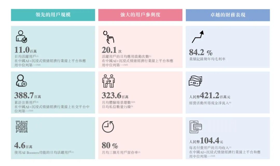根据弗若斯特沙利文报告,Soul的平均日活跃用户数、用户平均每日启动次数及新安装用户的30日留存率均在中国AI+沉浸式社交平台中排名第一。 Soul已累计有约3.89亿注册用户。2025年前八个月,每天都有用户登录Soul进行交流、连接和探索超过50分钟。每月,用户在Soul平台上创建或参与超过3.23亿次基于兴趣的活跃“体验”场景。