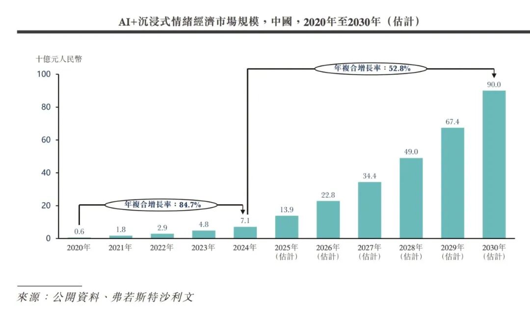 弗若斯特沙利文报告显示,2024年,中国AI+沉浸式情绪经济市场规模为人民币70亿元,预计2030年将有望达到人民币900亿元,期间年复合增长率为52.8%。