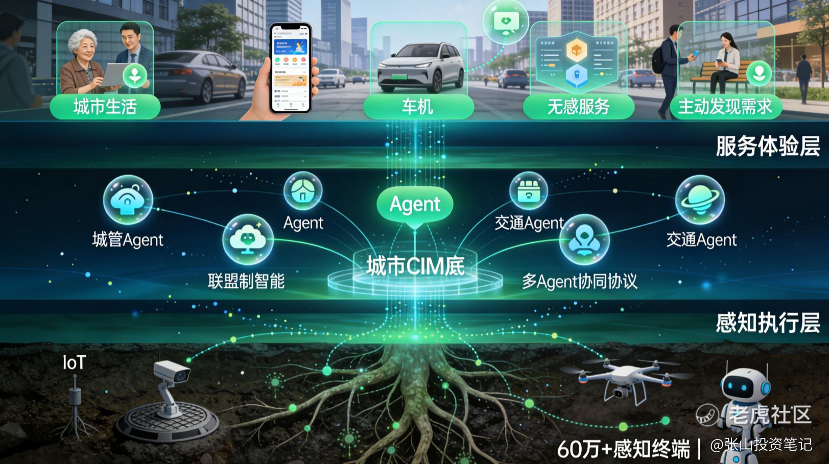 底层为感知执行层,IoT设备、无人机、机器人作为Agent的五官手脚,实现与物理世界的实时交互。数字政通布局的低空经济场景,本质就是在抢占这一关键入口,通过无人机等设备构建空天地一体化感知网络。中层是认知决策层,由行业大模型+专业Agent构成城市大脑。这并非中心化的单一大脑,而是无数专业Agent的联邦制,城管Agent、交通Agent、应急Agent各司其职,通过语义化通信协议实现协同。雄安新区构建的边云超智计算体系已现雏形,60余万个感知终端实时汇聚数据,通过BIM+CIM平台实现物理城市与数字空间的同步映射。上层是服务体验层,市民通过手机、车机、智能家居与Web Agent交互,一句话就能完成预约医院-规划路线-调整信号灯的全流程闭环,峥峰数防的智慧消防案例已展现这种模式的潜力。
