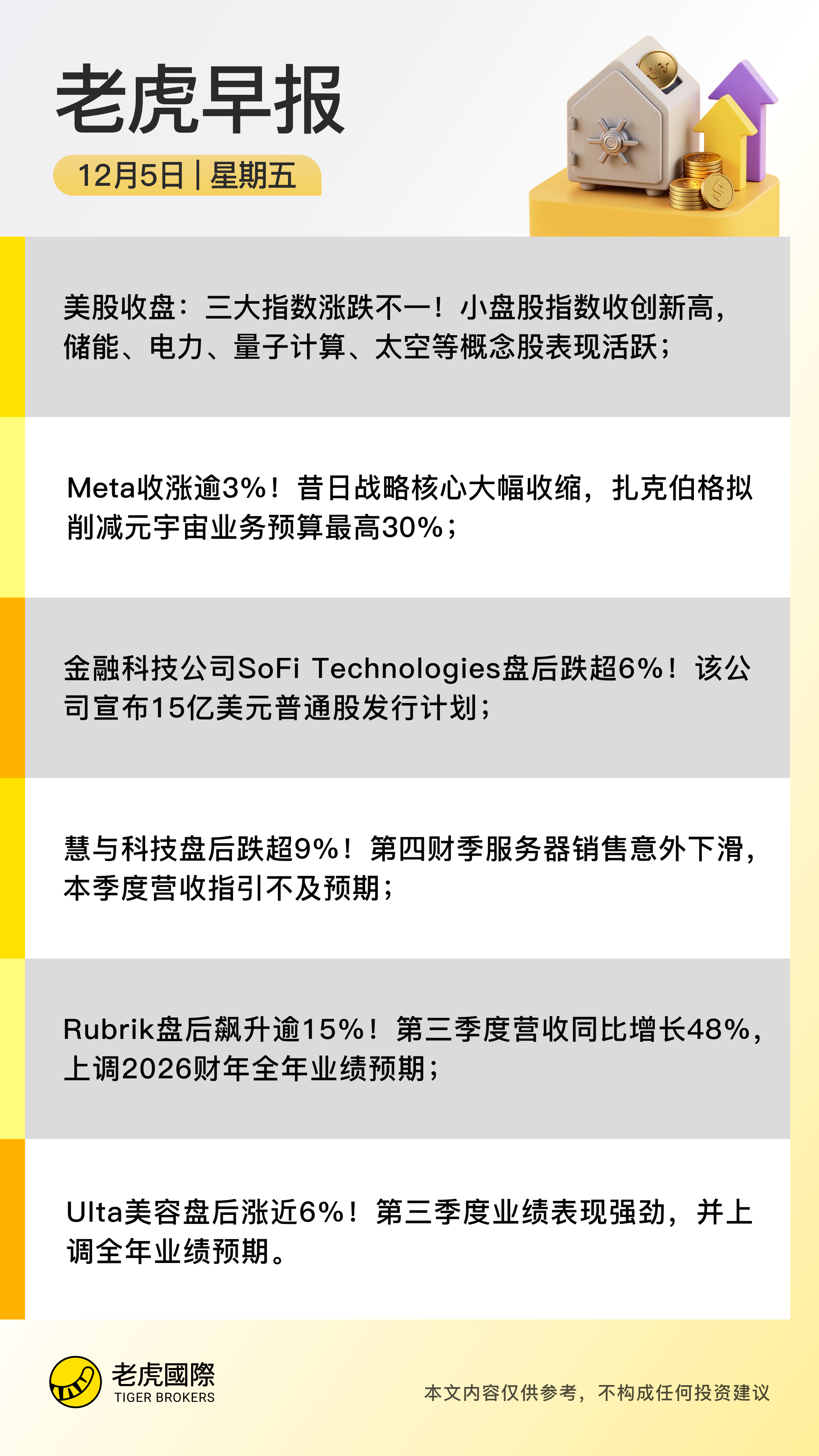 美股收盘:三大指数涨跌不一!小盘股指数收创新高,储能、电力、量子计算、太空等概念股表现活跃