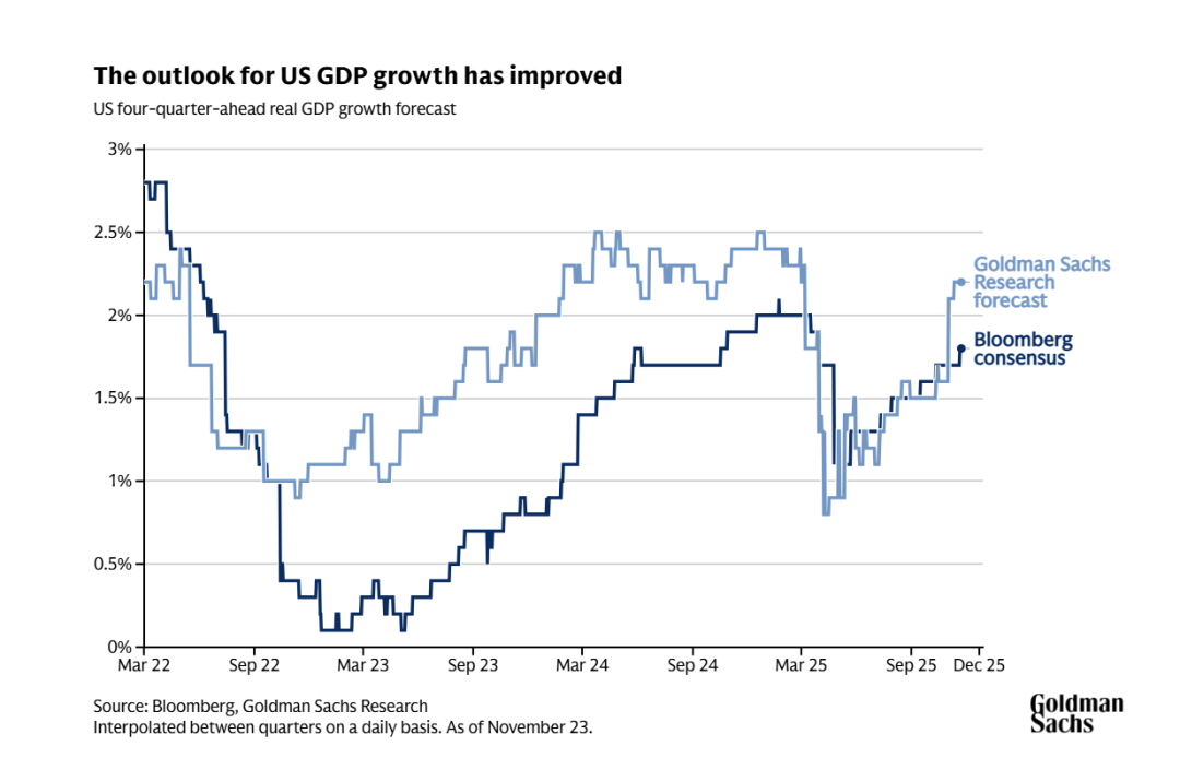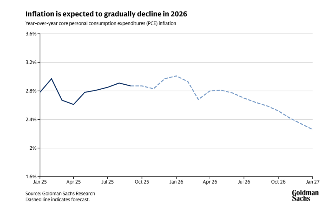 高盛研究预测,美国经济增长将在2026年实现加速,达到2.0%至2.5%的区间 。这种加速预期得益于两大主要驱动力:一是关税影响的减弱,这减轻了供应链成本压力;二是税收减免和金融条件的进一步宽松 。这些有利因素预计将提振就业创造,使失业率能够稳定在一个仅略高于同年9月记录的4.4%水平 。