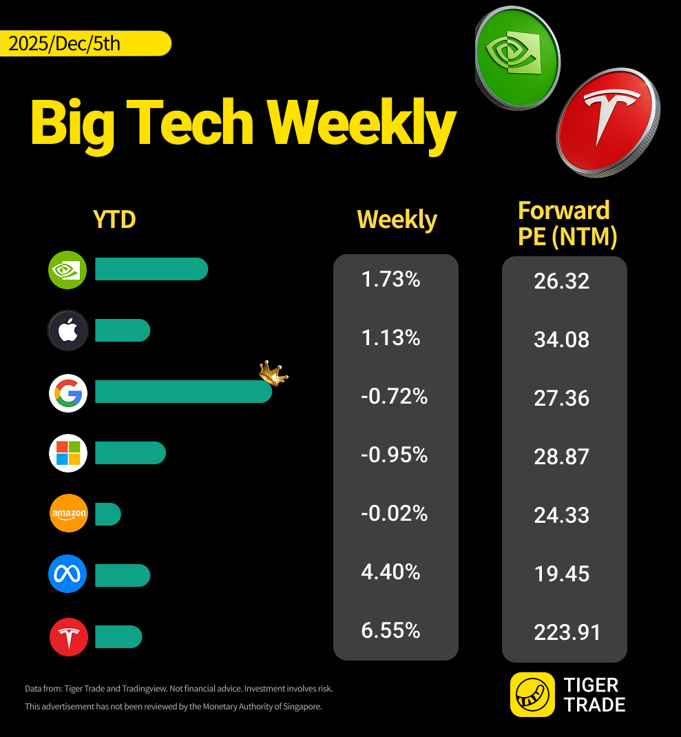 大科技本周表现不错。截止12.4收盘,过去一周tesla大涨6.5%,meta上涨4.4%,苹果nvda上涨1%左右,amzn,msft,goog小幅下跌。