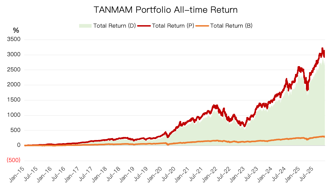 七巨头(Magnificent Seven)组成一个投资组合(“TANMAMG”组合),等权重、每季度重新调整权重。回测结果从2015年以来表现是远超标普500的总回报达到了3137.63%,同期SPY回报300.36%,超额收益2837.26%,仍然在高位。